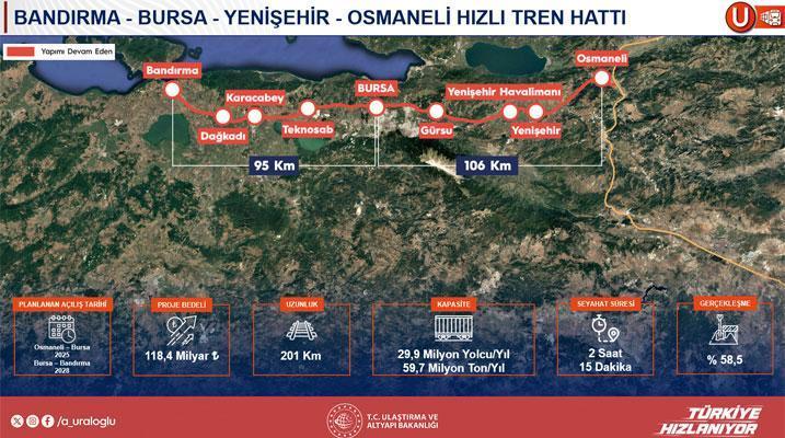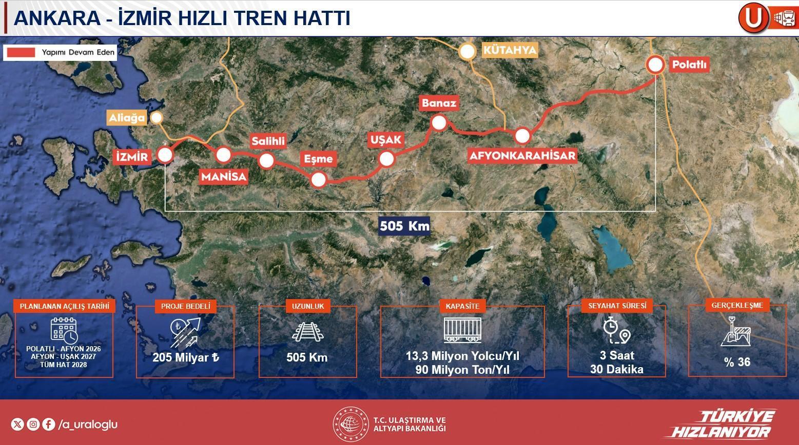 Bakan Abdulkadir Uraloğlu, Türkiye genelinde devam eden demiryolu projelerine ait kapsamlı bilgi vererek, süratli tren ve yük nakliyeciliğine yönelik kıymetli adımlar attıklarını vurguladı. Ankara-İzmir Süratli Tren Hattı’nda çalışmaların sürdüğünü belirten Uraloğlu, sınırın 2026’da Afyon’a, 2027–2028 yıllarında ise İzmir’e kadar tamamlanmasının hedeflendiğini söyledi. Ankara İstanbul ortasından süratli trenden ayrılıp Osmaneli’nden Bursa’dan Bandırma’ya kadar giden sınır ile ilgili de bilgiler veren Uraloğlu, ‘Yaklaşık 200 kilometre civarında. Bunu da bu sene sonu itibariyle Bursa’ya kadar çaba ediyoruz. Biraz argümanlı olmakla bir arada. Geri kalanını da 2028’e kadar bitirmiş olacağız.’ tabirlerini kullandı.