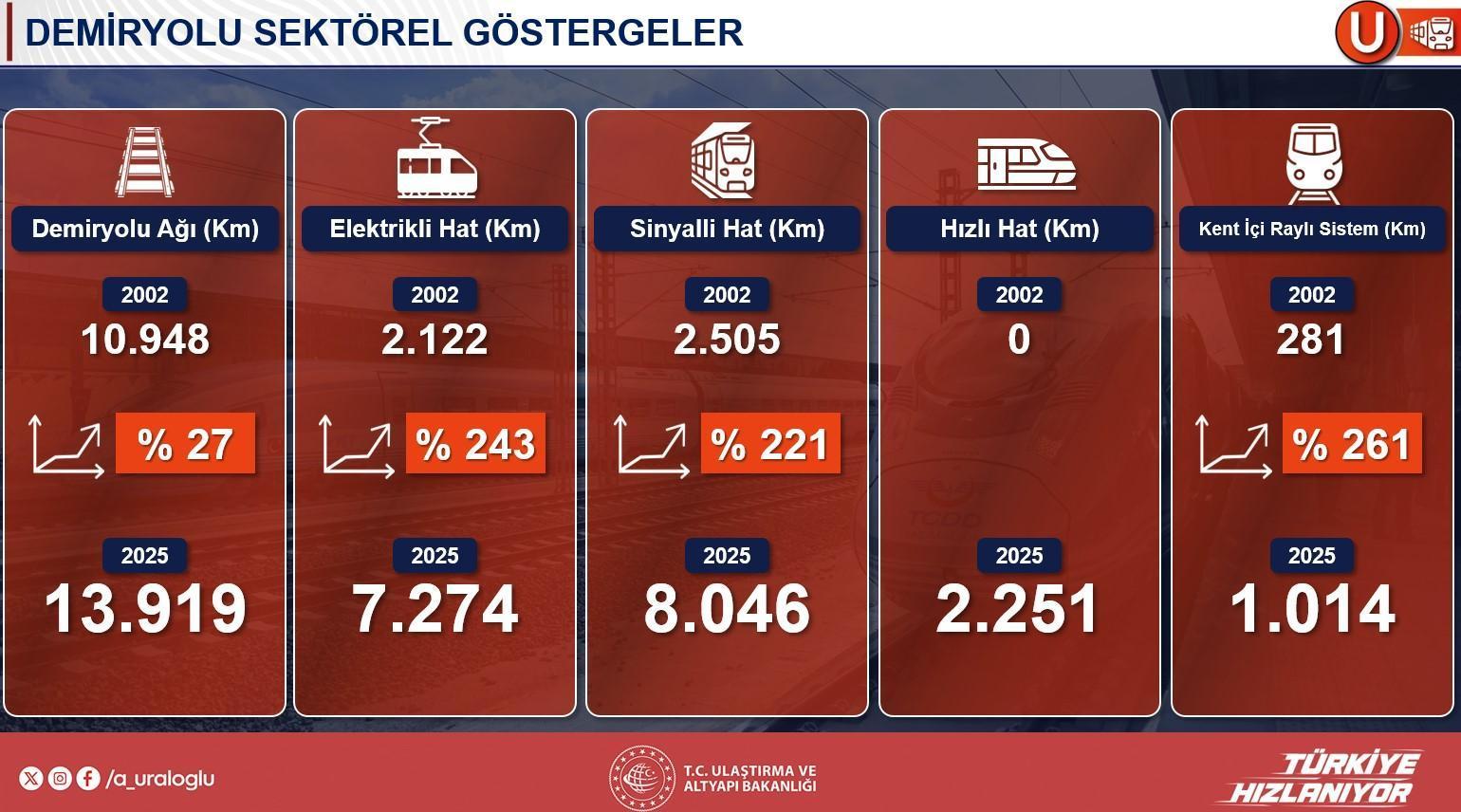 Bakan Uraloğlu, demiryolu alanındaki yatırımları kıymetlendirerek, Türkiye’nin demiryolu ağını 10.900 kilometreden yaklaşık 14.000 kilometreye çıkardıklarını açıkladı. Elektrikli ve sinyalli sınır oranlarının ise %60 ila %80’e ulaştığını belirten Uraloğlu, bu dönüşümün çevreci ve kapasite artırıcı tesirine dikkat çekti. Türkiye’nin Avrupa’da 6., dünyada 8. yüksek süratli tren işletmecisi pozisyonuna geldiğini ve 2.251 kilometre yüksek süratli demiryolu sınırı inşa edildiğini söyledi. Ayrıyeten bakanlık olarak 14 vilayette 1.014 kilometre kent içi raylı sistem çizgisi yaptıklarını, bu çizgilerin bir kısmının belediyelere devredildiğini, bir kısmının ise direkt işletildiğini söz etti.