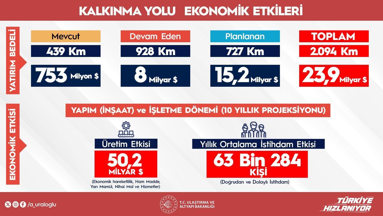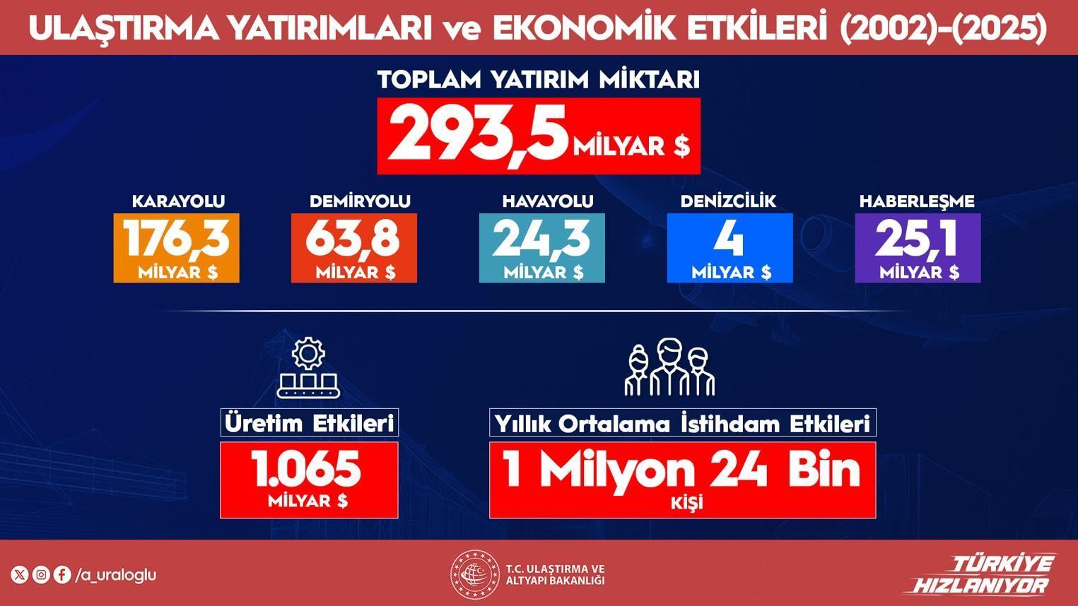 2002 yılından bu yana 293,5 milyar dolarlık bir yatırım yaptıklarını belirten Uraloğlu, ‘Bizim ölçeğimizdeki bir ülke için sahiden güzel bir yatırım. Karayolları, demiryolları, havayolu, denizcilik ve haberleşme noktasında bunun üretime katkısının yaklaşık bir trilyon dolar olduğunu hesaplıyoruz.’ tabirlerini kullandı.