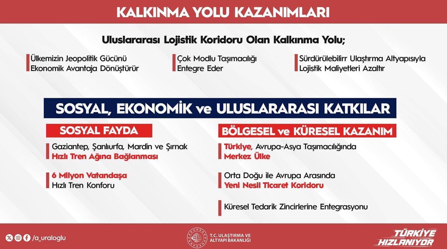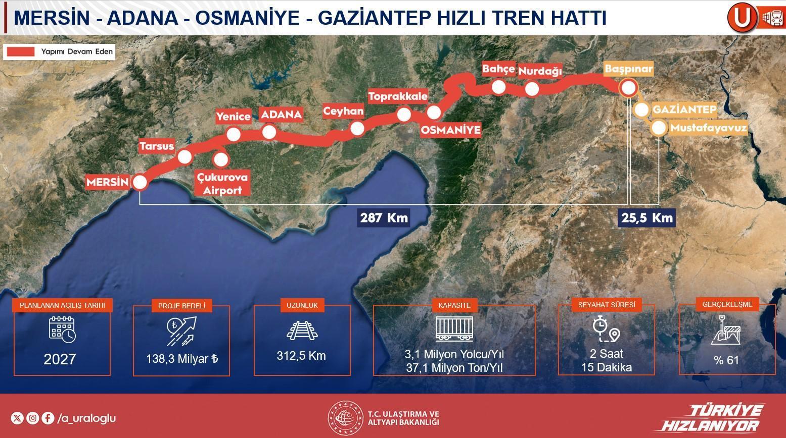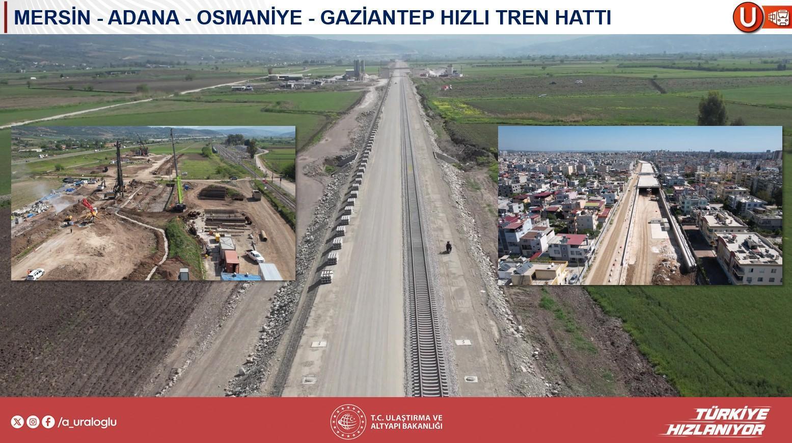 Kalkınma Yolu’nun kıymetli modülü olan Mersin-Adana-Osmaniye-Gaziantep sınırında (312 km) çalışmaların süratle sürdüğünü belirten Uraloğlu, sınırın birtakım kısımlarının dört sınırlı olacağını ve 2026–2027 devrinde tamamlanacağını söyledi. Ankara-Sivas süratli tren çizgisinin doluluk oranlarının %100’e ulaştığını vurgulayan Uraloğlu, bu çizginin devamı olan Yerköy-Kayseri süratli tren projesinin de 2028’e kadar tamamlanacağını kaydetti. Karaman-Ulukışla sınırının da Mersin-Adana-Yenice ilişkisiyle entegre olduğunu ve 2027’de tamamlanmasının planlandığını belirtti.