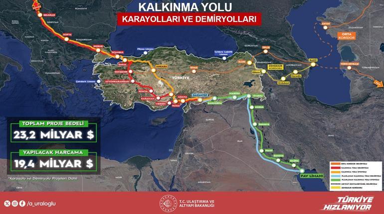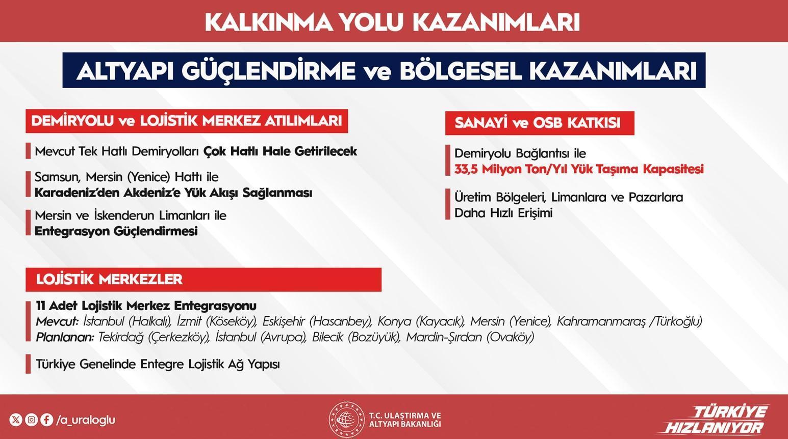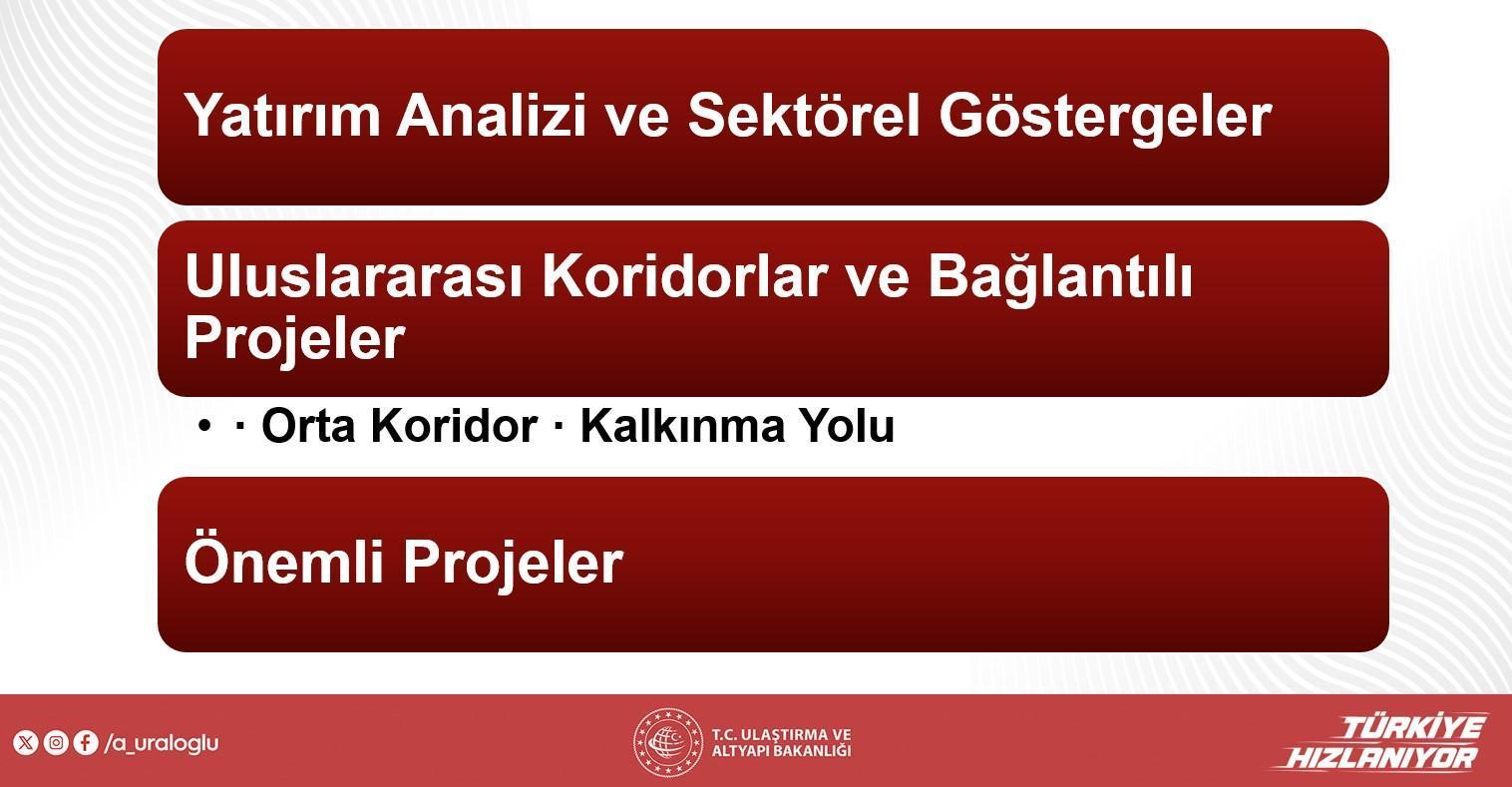 Kalkınma Yolu’nun kıymetli modülü olan Mersin-Adana-Osmaniye-Gaziantep sınırında (312 km) çalışmaların süratle sürdüğünü belirten Uraloğlu, sınırın birtakım kısımlarının dört sınırlı olacağını ve 2026–2027 devrinde tamamlanacağını söyledi. Ankara-Sivas süratli tren çizgisinin doluluk oranlarının %100’e ulaştığını vurgulayan Uraloğlu, bu çizginin devamı olan Yerköy-Kayseri süratli tren projesinin de 2028’e kadar tamamlanacağını kaydetti. Karaman-Ulukışla sınırının da Mersin-Adana-Yenice ilişkisiyle entegre olduğunu ve 2027’de tamamlanmasının planlandığını belirtti.