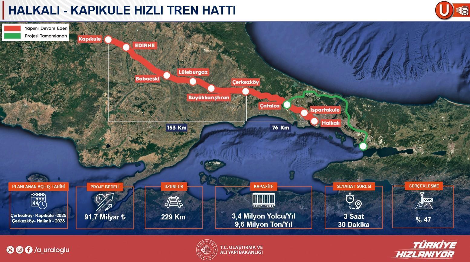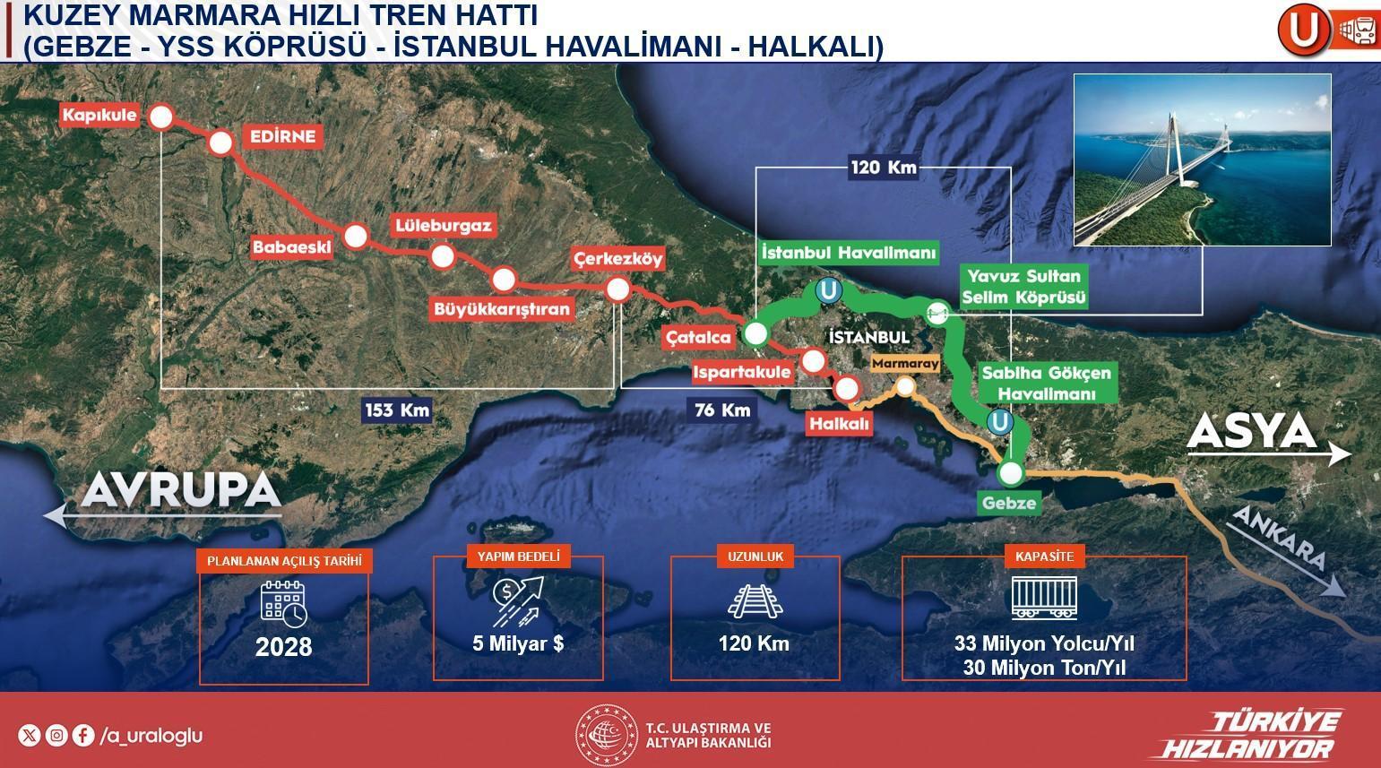 Bakan Uraloğlu, Marmaray sınırının ağır yolcu nakliyatı nedeniyle yük trenlerine sonlu kapasite sunduğunu belirterek, ‘Günde 300 seferle yaklaşık 700 bin yolcu taşıyoruz, bu nedenle yalnızca 4 yük trenine müsaade verebiliyoruz’ dedi. Bu sebeple Yavuz Sultan Selim Köprüsü’nün projelendirilirken ortasına çift çizgili demiryolu bırakıldığını hatırlatan Uraloğlu, Gebze’den başlayarak Sabiha Gökçen Havalimanı, Yavuz Sultan Selim Köprüsü, İstanbul Havalimanı ve Çatalca üzerinden Halkalı-Kapıkule sınırına bağlanacak 120 km’lik süratli tren projesi için Dünya Bankası uyumunda kredi sürecinin tamamlanmak üzere olduğunu belirtti. ‘Bu sene ihalesini yaparak, seneye imaline başlamayı hedefliyoruz’ diyen Uraloğlu, proje tamamlandığında bu koridorda kapasite probleminin kalmayacağını ve yaklaşık 5 milyar dolarlık bir yatırım yapılacağını tabir etti. Ayrıyeten, Çerkezköy-Kapıkule ortasının 2025’te, Çerkezköy-Halkalı çizgisinin ise büyük ihtimalle 2027 yılında tamamlanacağını söyledi. ‘Yavuz Sultan Selim Köprüsü geçişini bitirdiğimizde, devamındaki kontakları da her halükarda tamamlamış olacağız’ dedi.