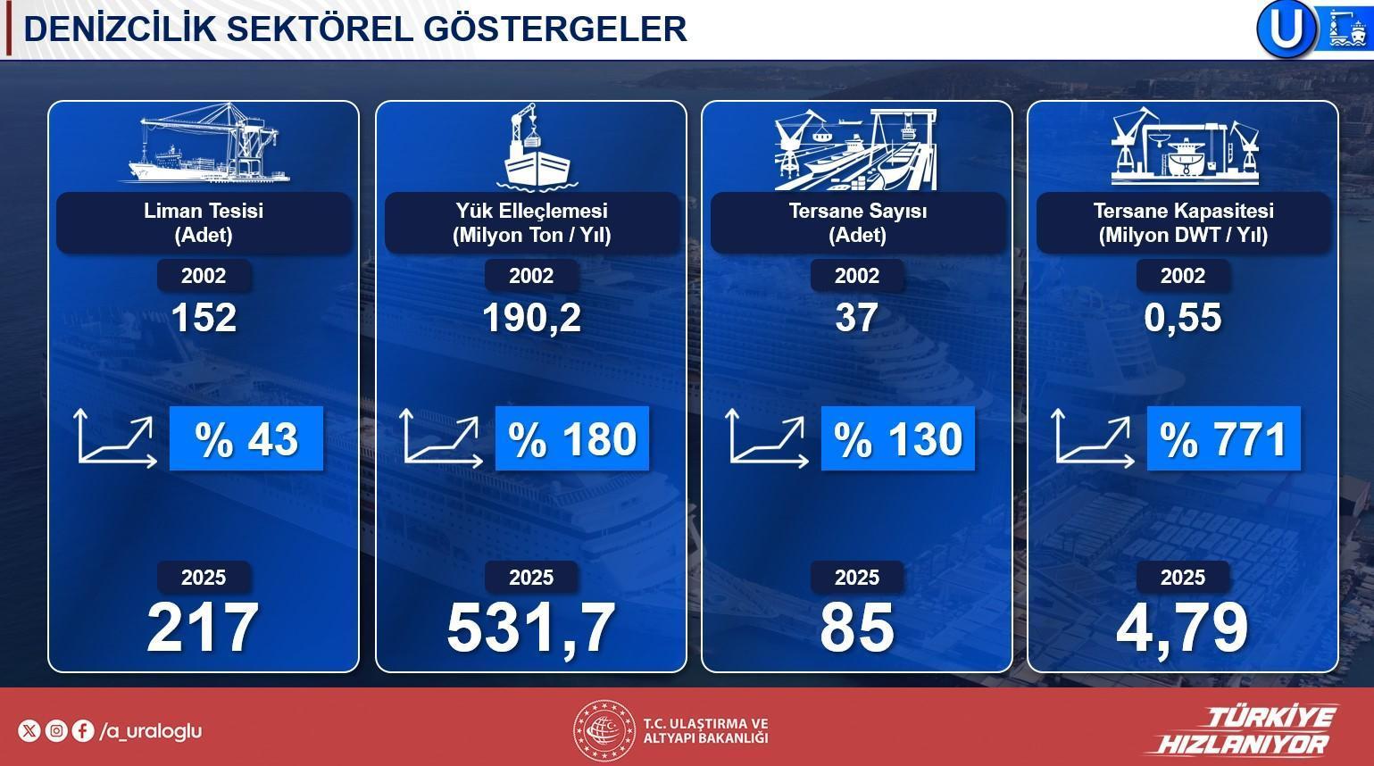 Bakan Uraloğlu, denizcilik dalındaki gelişmelerle ilgili ise, 152 olan liman tesisi sayısının bugün 217’ye çıktığını, yük elleçleme kapasitesinin ise 190 milyon tondan 532 milyon tona yükseldiğini belirtti. Tersane sayısının 37’den 85’e çıkarıldığını söz eden Uraloğlu, tersanelerin üretim kapasitesinin de 550 bin detveyt tondan 4,8 milyon detveyt tona ulaştığını söyledi. Uzak Doğu’yla olağan yük gemisi üretiminde rekabet edilemediğini vurgulayan Bakan, özellikli gemilerde ise Türkiye’nin Avrupa ve dünya pazarında değerli bir yer edindiğini, LNG’li, hidrojen yakıtlı ve elektrikli feribotlar üzere ileri teknolojili gemilerin üretiminin muvaffakiyetle yapıldığını kaydetti.