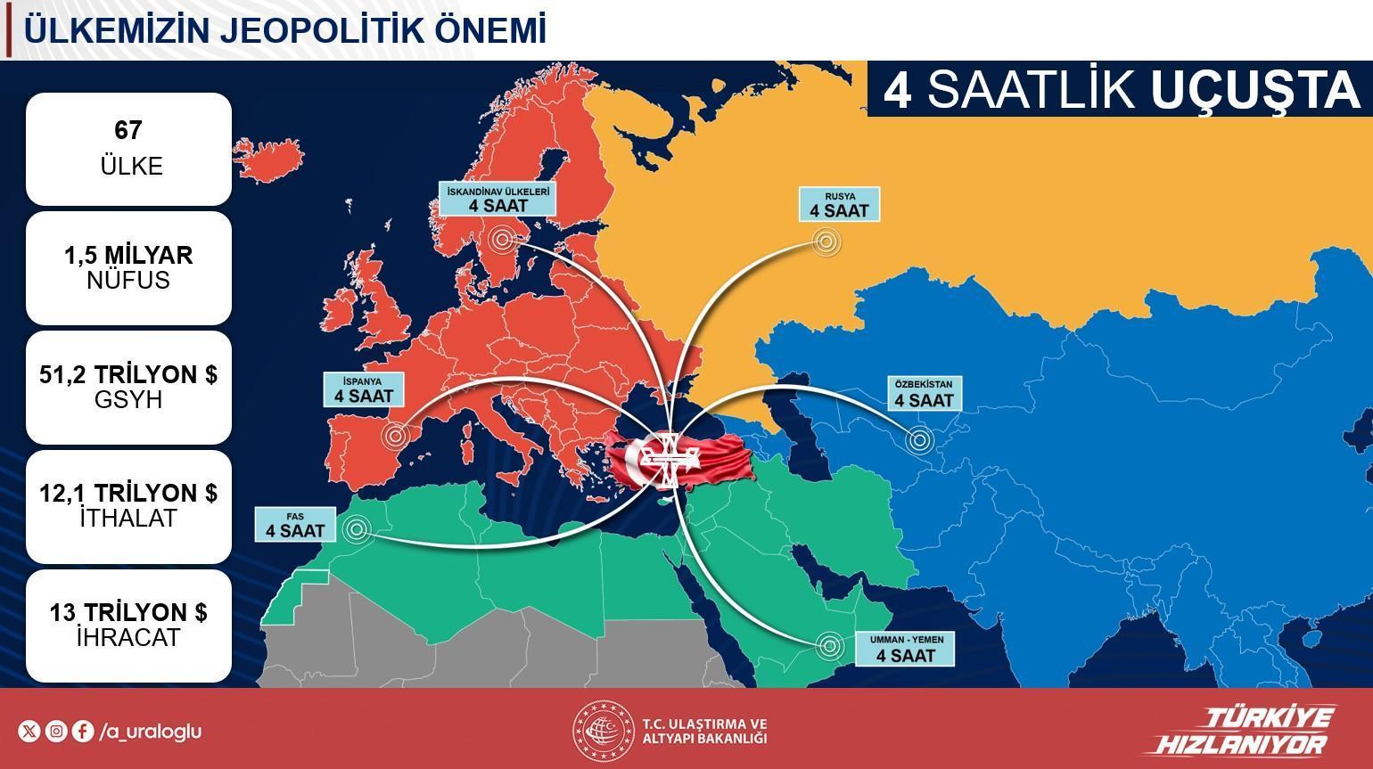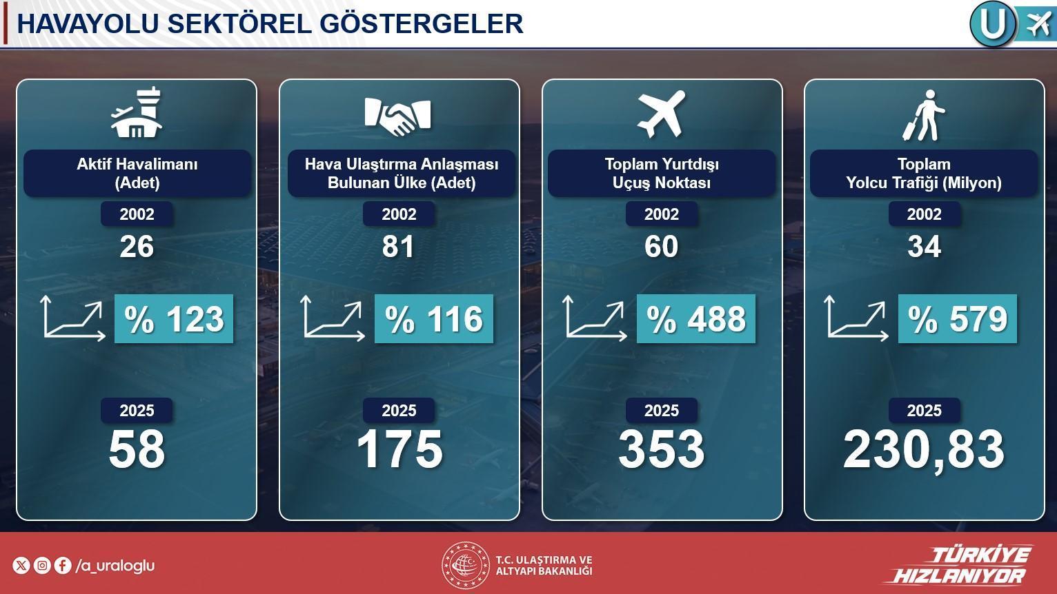 Bakan Uraloğlu, havayolu dalındaki gelişmeleri de aktararak, 2002’de 26 olan etkin havalimanı sayısının bugün 58’e çıktığını, Yozgat ile Bayburt-Gümüşhane havalimanlarının da üretiminin sürdüğünü belirtti. Türkiye’nin havacılık muahedesi yaptığı ülke sayısının 81’den 175’e yükseldiğini, uçuş noktası sayısının ise 60’tan 353’e çıkarak dünya rekoruna ulaştığını tabir etti. 2002’de 34 milyon olan toplam yolcu trafiğinin 2023’te 231 milyona ulaştığını söyleyen Uraloğlu, bu yılki gayelerinin 240 milyon yolcu olduğunu vurguladı. İstanbul Havalimanı’nın geçen yıl 80 milyon, Sabiha Gökçen ve Antalya Havalimanlarının ise 40’ar milyon yolcuyla dikkat çektiğini kaydetti.