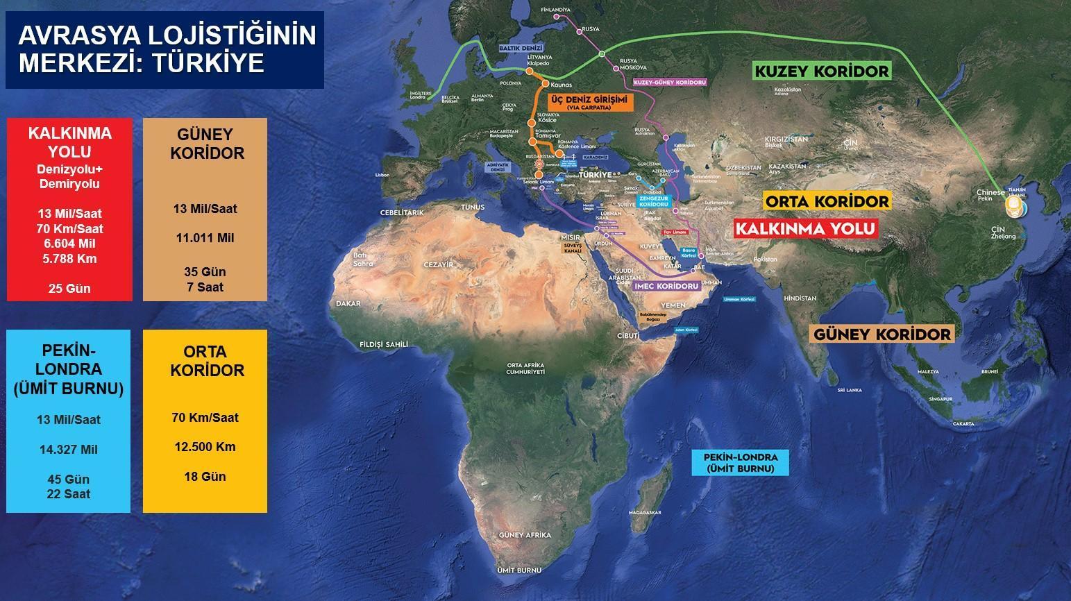 Türkiye’nin jeopolitik ve jeostratejik pozisyonuna dikkat çeken Bakan Uraloğlu, 4 saatlik uçuş uzaklığıyla 67 ülkeye erişilebildiğini, bunun 1,5 milyar insan, 51 trilyon dolarlık GSYH ve 25 trilyon dolarlık ticaret hacmine denk geldiğini söyledi. Doğu-Batı eksenindeki klasik ticaret yollarına ek olarak kuzey-güney istikametinde de artan yatırımlara vurgu yapan Uraloğlu, Süveyş Kanalı üzerinden 35 günde taşınan yüklerin, Kalkınma Yolu tamamlandığında 25 günde, Orta Koridor üzerinden ise 18 günde ulaştırılabildiğini, bu müddetin gelecekte 13 güne kadar düşürülebileceğini belirtti. Bu koridorların Türkiye’nin bölgesel ve global ticaretteki ehemmiyetini artırdığını tabir etti.