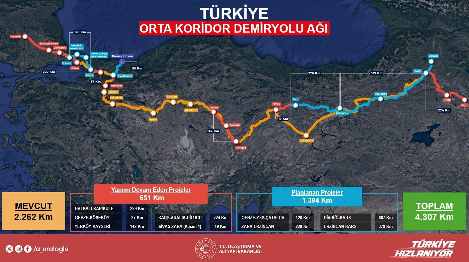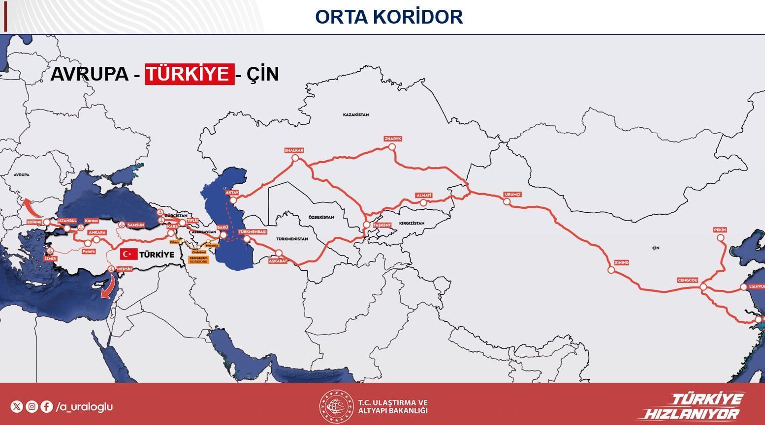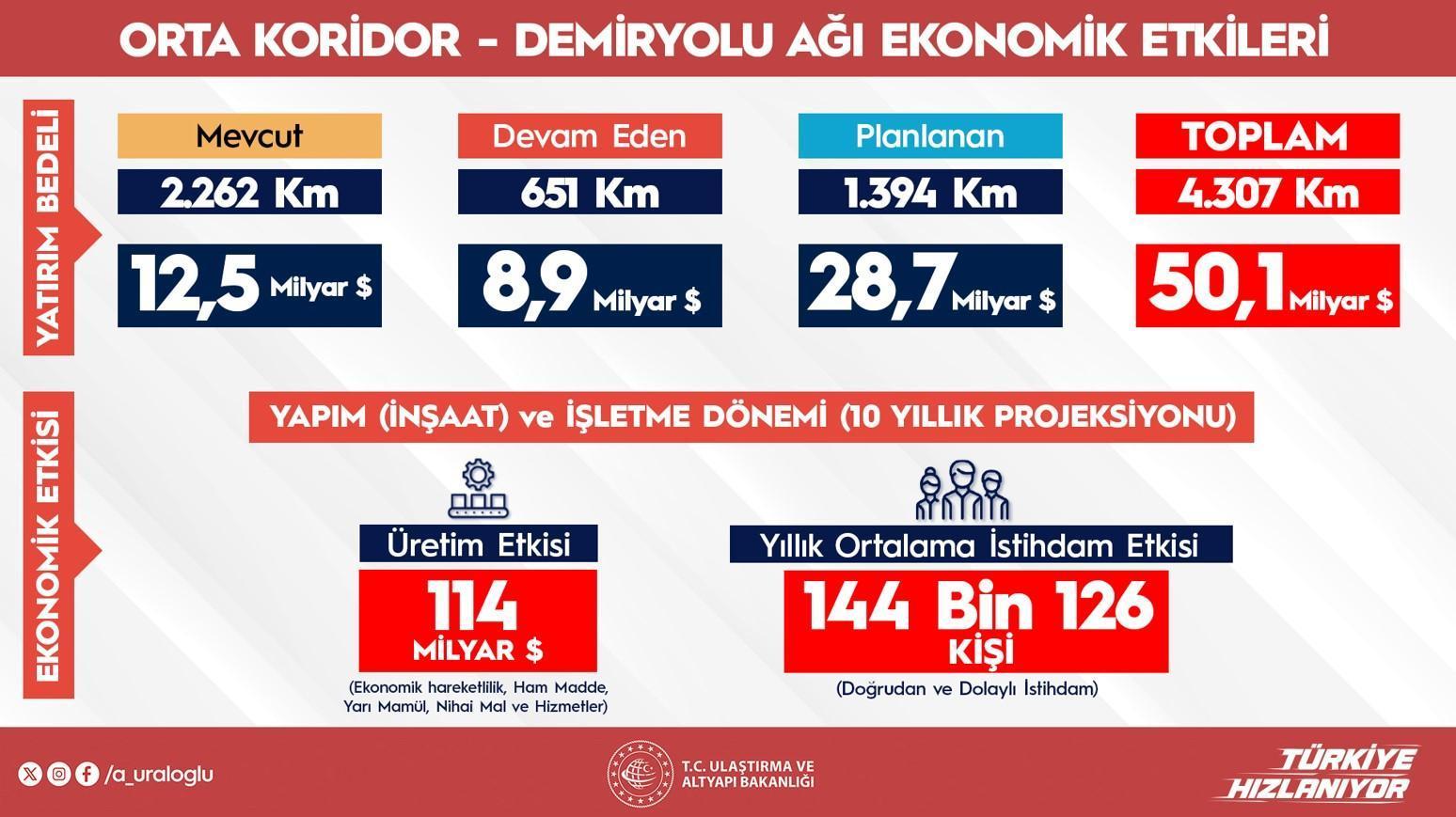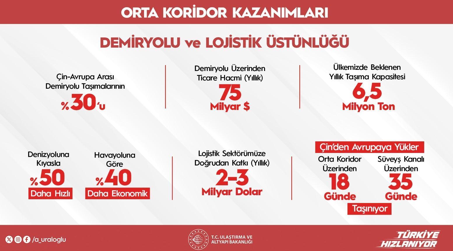 Türkiye hudutları içindeki 2.262 kilometrelik çizginin aşikâr kısımlarının tamamlandığını tabir eden Bakan Uraloğlu, kalan bölümler üzerinde çalışmaların sürdüğünü kaydederken, Marmaray geçişli demiryolu sınırının hâlihazırda sonlu kapasiteyle kullanıldığını ve bu kapasitenin artırılacağını söyledi. Koridorun yaklaşık 50 milyar dolarlık yatırımla hayata geçirileceğini, 114 milyar dolarlık üretim tesiri yaratacağını ve yıllık 144 bin bireye istihdam sağlayacağını aktardı. Çin-Avrupa ortasında demir yoluyla taşımaların gelecekte yüzde 30’a ulaşmasının beklendiğini tabir eden Uraloğlu, bu hatta taşınacak yük ölçüsünün en az 6,5 milyon ton olacağını belirtti. Orta Koridor’un 21 ülkeden geçtiğini ve Avrupa’ya ulaşmadan evvelki tek NATO ülkesinin Türkiye olduğunu hatırlatan Bakan, bu demiryolu hattının hem ekonomik hem stratejik açıdan büyük avantajlar sunduğunu söyledi.