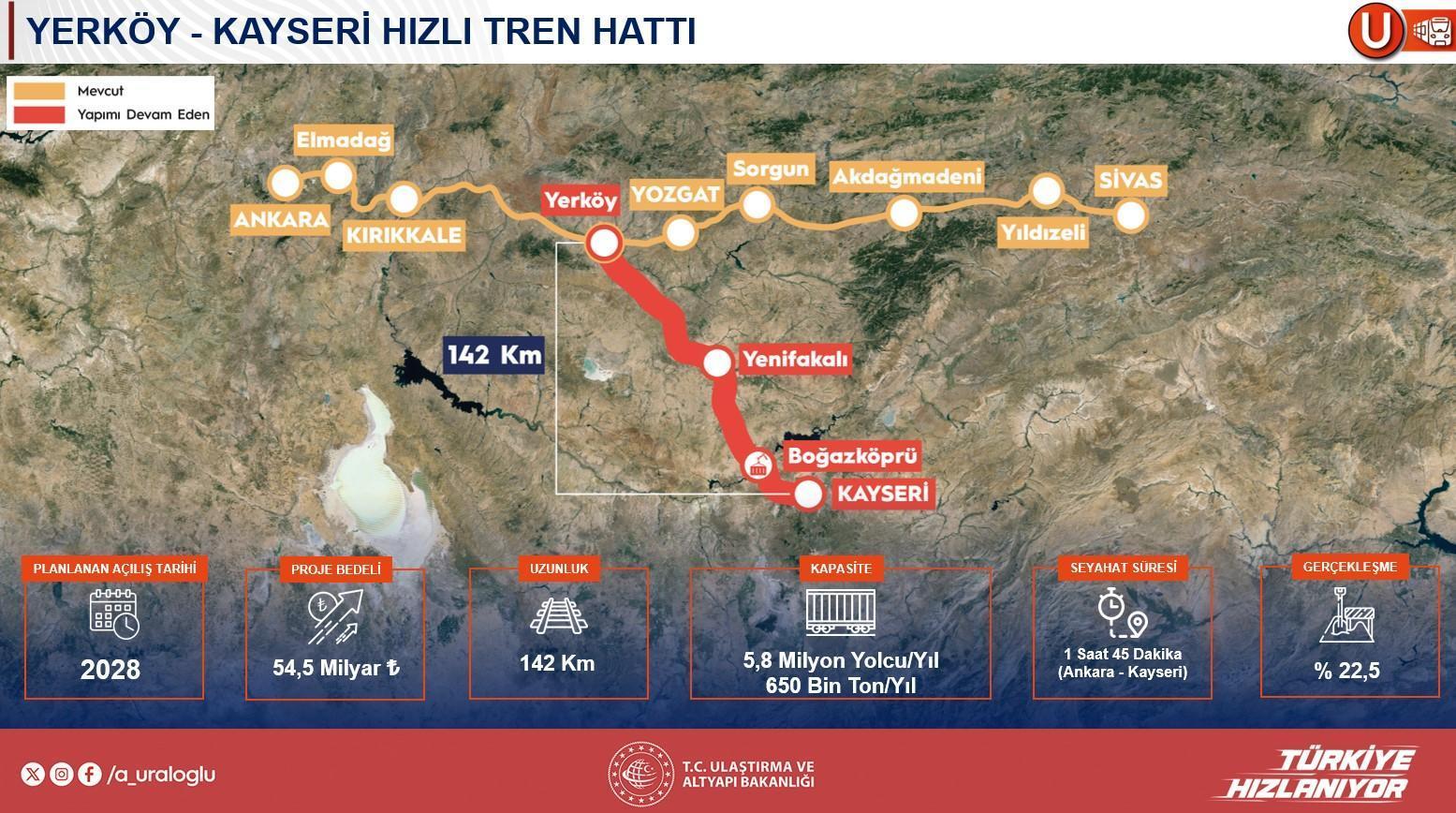 Hattın toplam uzunluğunun yaklaşık 2 bin 90 kilometre olacağını belirten Bakan, mevcutta 439 kilometrelik kısmın tamamlandığını, 928 kilometrede çalışmaların sürdüğünü ve 727 kilometrelik kısmın de yakında başlayacağını söz etti. Proje tamamlandığında 24 milyar dolarlık yatırım yapılacağını belirten Uraloğlu, ‘Ve burada da tekrar yıllık 50 milyar dolar ve ortalama olarak da yaklaşık 63 bin kişinin istihdamına burada katkı sağlamış olacağız. Ülkemizin yeniden bahsettiğimiz jeopolitik gücünü ekonomik avantaja dönüştürecektir. Çok modlu nakliyeciliği destekleyecek, sürdürülebilir ulaştırma ve karbon ayak izinin yönetilmesi ve Avrupa’da bu manada bir vergilendirmeye tabi olmamak için demiryolu bölümünü yeşil güçle birlikte her kaidede destekliyoruz. Süratli tren ağları birçok vilayetimize bu vesileyle bağlanmış olacak ve altı milyon yeni vatandaşımıza bu vesileyle ulaşmış olacağız ve ülkemizde bunlar yalnızca bir transit koridor değil tıpkı vakitte ülkemizde lojistik üsler manasında da üretim merkezlerinin gelişmesini destekleyecektir.’ sözlerini kullandı.