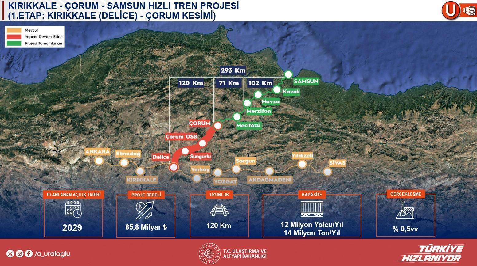 Yeni başlayan Delice-Çorum çizgisinin Samsun’a uzanacak bir altyapının birinci adımı olduğunu lisana getiren Uraloğlu, bu sınırın 2028-2029 ortasında tamamlanmasını ve gelecek yıl Samsun’a kadar olan kısmın ihalesinin yapılmasını öngördüklerini söyledi. Samsun-Sarp ortası için proje çalışmalarının başladığını da ekleyen Bakan, bu projenin ise daha uzun vadeli olduğunu söz etti.
