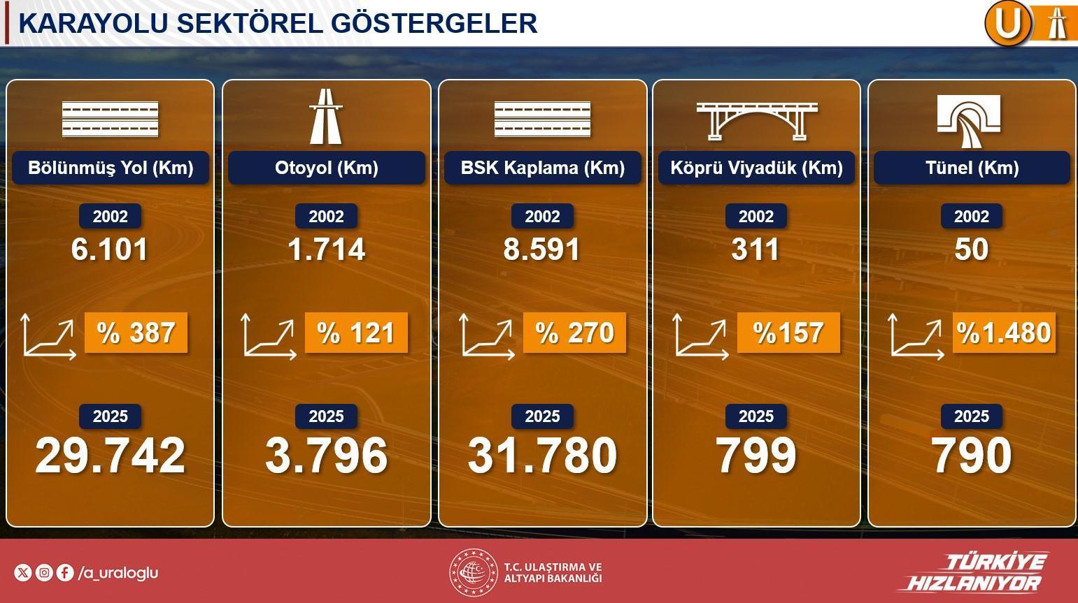 Ulaştırma ve Altyapı Bakanı Abdulkadir Uraloğlu, karayolu yatırımlarında gelinen noktayı özetleyerek, dalda direkt ve dolaylı yaklaşık bir milyon bireye istihdam sağlandığını belirtti. Bölünmüş yol uzunluğunun 6.101 kilometreden 29.742 kilometreye çıkarıldığını ve bu yolların toplam yol ağının yüzde 42’sini oluşturmasına karşın trafik hareketinin yüzde 80-85’inin bu yollarda gerçekleştiğini söz etti. Otoyol uzunluğunun 1.700 kilometreden 3.800 kilometreye, sıcak asfalt kaplamanın 8.500 kilometreden 32.000 kilometreye yükseldiğini aktaran Uraloğlu, tünel uzunluğunun 50 kilometreden 790 kilometreye, viyadük uzunluğunun ise 311 kilometreden 799 kilometreye çıkarıldığını söyledi. Bakan, artık zorlu coğrafyalarda çalışıldığını ve bu nedenle viyadük ile tünel üretiminin büyük kıymet taşıdığını vurguladı.