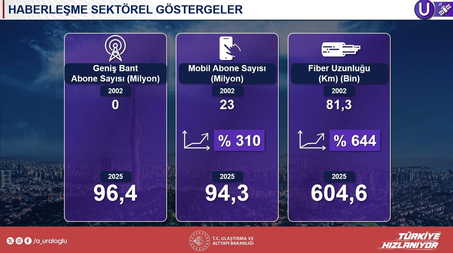 ‘İletişim noktasında 96,5 milyon bir geniş bant abone sayımız var.’ diyen Bakan Uraloğlu, ‘Mobil abone de yaklaşık 94 milyon ve fiber ağ uzunluğumuz 605 bin kilometreye ulaşmış durumda. Bunu birinci etapta 800 bin kilometreye ulaştırmayı hedefliyoruz.’ sözlerini kullandı.