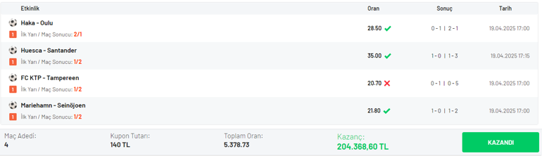 Misli üyesi, 4 maçtan oluşan bir sistem kuponu yaptı. Kupondaki en dikkat cazip maç ise La Liga 2’de oynanan Huesca – Racing Santander müsabakası oldu. Misli üyesi bu gayret için Birinci Yarı / Maç Sonucu: 1/2 varsayımında bulundu. Mesken sahibi Huesca, maçın şimdi başında geliştirdiği atakta Njoh’un vuruşunda Racing kalecisi Ezkieta’yı geçemedi. Rakip kalede tehlike yaratmaya devam eden Huesca, savunma ardına sarkan Huesca’nın ortaya çevirdiği topu boş kaleye yollayan Canellada’nın golüyle 1-0 öne geçti. Misli üyesinin beklediği birinci yarı mesken sahibi üstünlüğü şimdi maçın başında geldi. Birinci yarıda kalan dakikalarda rastgele net durum yaşanmadı ve konut sahibi Huesca, devreyi 1-0 önde kapattı. Huesca’da 3 oyuncu kırmızı kart gördü, maçın seyri büsbütün değişti İkinci yarıya tehlikeli başlayan Huesca 2. gole yaklaştı. Njoh’un karşı karşıya kaldığı durumda yaptığı plase vuruşta Santander kalecisi gole geçit vermedi. Huesca, 57 ve 58’de üst üste gördüğü iki kırmızı kartla 9 kişi kaldı ve maçın gidişatı büsbütün değişti. Racing, bu dakikadan sonra rakip kaledeki baskısını çabucak golle sonuçlandırdı ve 60’ta skora istikrar geldi: 1-1. Huesca’daki şanssızlıklar silsilesi bununla da kalmadı. 68’de kaleci Dani Jimenez’in sakatlığı sonrası yedek kaleci Adrian Franco oyuna dahil oldu. Racing Santander, 83’te ceza alanında topla buluşan Andres Martin’in olağanüstü şutunda skordaki dengeyi bozdu: 1-2. 90+3’te bir oyuncusu daha atılan ve düzgünce dağılan Huesca savunmasının açıklarını pahalandıran Racing, 90+7’de Juan Gomez’in golüyle skoru belirledi: 1-3. Böylelikle Misli üyesinin beklediği geri dönüş de tamamlanmış oldu. Misli üyesi, Birinci Yarı / Maç Sonucu: 1/2 varsayımıyla kuponun en yüksek oranı olan 35.00’i bilmiş oldu. Misli üyesinin kuponunda bildiği öteki müsabakalar: Haka – Oulu Birinci Yarı / Maç Sonucu: 2/1 – 28.50