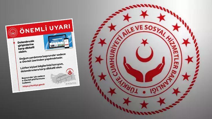 Aile ve Sosyal Hizmetler Bakanlığı, vatandaşları dolandırıcılara karşı uyararak, doğum yardımı müracaatlarının yalnızca e-Devlet üzerinden yapıldığını bildirdi.