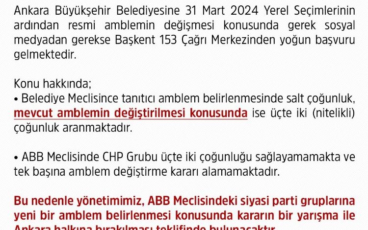 Konuyla ilgili Belediye Meclisi’nce tanıtıcı amblem belirlenmesinde salt çoğunluğun mevcut amblemin değiştirilmesi konusunda ise üçte iki (nitelikli) çoğunluk arandığı anımsatılarak, Ankara Büyükşehir Belediye Meclisi’nde CHP Grubu’nun 3’te 2 çoğunluğu sağlayamadığı ve tek başına amblem değiştirme kararı alamadığı vurgulandı. Belediyeden yapılan yazılı açıklamada, “Bu nedenle yönetimimiz, Ankara Büyükşehir Belediye Meclisi’ndeki siyasi parti gruplarına yeni bir amblem belirlenmesi konusunda kararın bir yarışma ile Ankara halkına bırakılması teklifinde bulunacaktır” denildi.