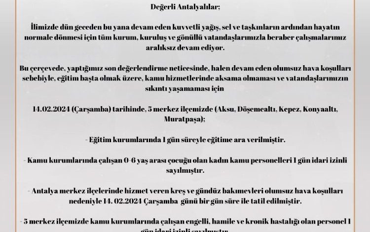 Antalya Valiliği’nden yapılan yazılı açıklamada, il genelinde halen devam eden hava koşulları dolayısıyla eğitim başta olmak üzere, kamu hizmetlerinde aksama olmaması ve vatandaşların sıkıntı yaşamaması için 14 Şubat Çarşamba tarihi itibariyle Aksu, Döşemealtı, Kepez, Konyaaltı ve Muratpaşa’da 5 merkez ilçedeki eğitim kurumlarında 1 gün süreyle eğitime ara verildiği duyuruldu.