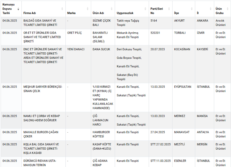Son yapılan testlerde; baharatta yasaklı boya, dana kıyma ve lahmacunda tek tırnaklı eti, sucukta sakatat ve deri dokusu kullanımı tespit edildi.