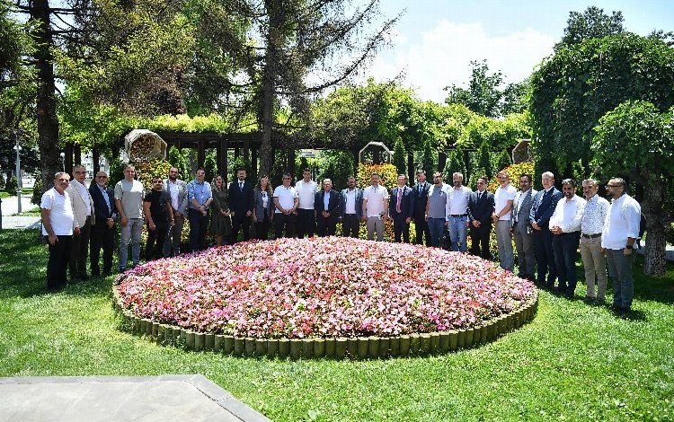 Büyükşehir Belediye Başkanı Dr. Memduh Büyükkılıç, toplantı sonrası katılımcılarla Büyükşehir Belediyesi bahçesinde hatıra fotoğrafı çektirdi.