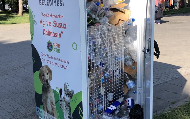 Sokakta su ve yiyecek bulmakta zorlanan hayvanlar için geliştirilen otomat, atılan her atık karşılığında mama vererek sokaktaki sahipsiz can dostların beslenmesine katkı sağlıyor