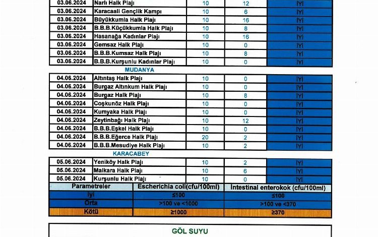 Bursa’da Gemlik’te 8, Mudanya’da 9, Karacabey’de 3 ve İznik Gölü kıyısında4 olmak üzere toplamda 24 kamp ve plajda yapılan Yüzme Suyu Kilrliği’ne ilişkin ilk tur sonuçlarını açıkladı.