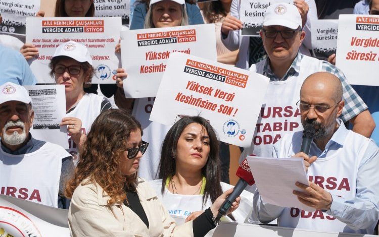 Zümrütevler Aile Sağlığı Merkezi önünde, ‘Vergide Adalet İstiyoruz’ pankartı açan hekimler adına konuşma yapan Bursa Tabip Odası Başkanı Dr. Levent Tufan Kumaş, “Biz işçiler, emekçiler, emekliler, hekimler, dişhekimleri, hemşireler… yani ücretli geçinenler olarak yüksek enflasyon ve durmak bilmeyen zamlarla her gün yoksullaşıyoruz. Ülkemizde gelir dağılımı hızla bozuluyor. Düşük ücretlerle, azalan alım gücümüzle, sendikalaşmanın ve hak aramanın önündeki engellerle, meslek örgütlerinin işlevsiz hale getirilmeye çalışıldığı bir düzende emek sömürüsü her gün biraz daha katmerleniyor. Tüm bunlar yetmezmiş gibi adaletsiz vergi sistemi nedeniyle kaşıkla verilen kepçeyle geri alınıyor. Enflasyonun altında ezilen ücret artışları dahi cebimize yansımadan vergilerle geri alınıyor. Türkiye’de vergi yükü giderek daha fazla işçilerin, emekçilerin, emeklilerin dar gelirlilerin omuzlarına yıkılmaktadır. Vergide adaletin kantarı her gün biraz daha bozulmaktadır” diye konuştu.