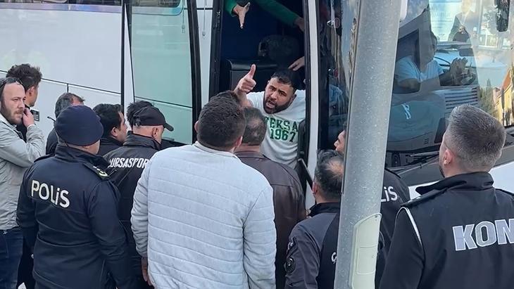 Bir taraftar ise eline aldığı alımlı kendilerine müdahale eden polise savurdu. Zahmetle araçlarına bindirilen taraftarlar yeniden geniş güvenlik önlemleri ortasında kentten ayrıldı.
