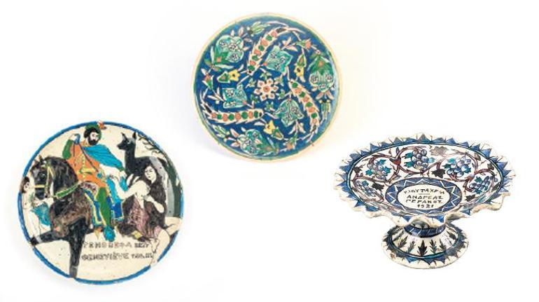 Sergide Minas’ın hayal gücünün, yaratıcılığının karşılık bulduğu eşsiz çiniler var. Biblolar, Osmanlıca yazılı tabaklar, şekerlikler, masa tablası üzere günlük eşyaların yanında tarihi bedele sahip kesimleri görüyoruz. Stant bu istikametiyle çininin periyodun toplumsal ve kültürel dinamikleriyle nasıl biçimlendiği üzerine kapsayıcı bir fotoğraf de çiziyor. 1920’lerde yapıldığı kabul edilen bardak seti bunlardan biri. Çelenk motifli çerçeve içinde Osmanlıca “Kütahya Anısı 1336 (1920)” yazıyor. Bardakların, Türkiye Büyük Millet Meclisi’nin açılışı onuruna üretilmiş bir setin kesimi olduğu varsayım ediliyor. Yeniden 1926-1930 yıllarına tarihlenen bir tabağın Nuri Conker tarafından Atatürk’ün yaveri Salih Bozok’a, Türkiye’nin yerli mallarındaki muvaffakiyetini simgeleyen bir ikram olarak sunulduğu bilgisi not düşülmüş.