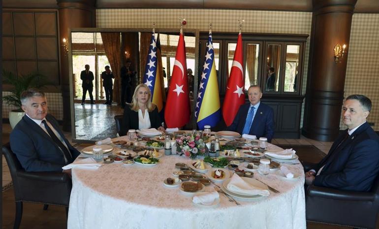 Cumhurbaşkanı Erdoğan, 4. Antalya Diplomasi Forumu için Antalya’da bulunan Bosna Hersek Devlet Başkanlığı Konseyi Başkanı ve Sırp üyesi Zeljka Cvijanovic, Hırvat üye Zeljko Komsic ve Boşnak üye Denis Becirovic ile bir ortaya geldi.