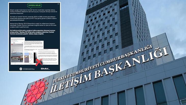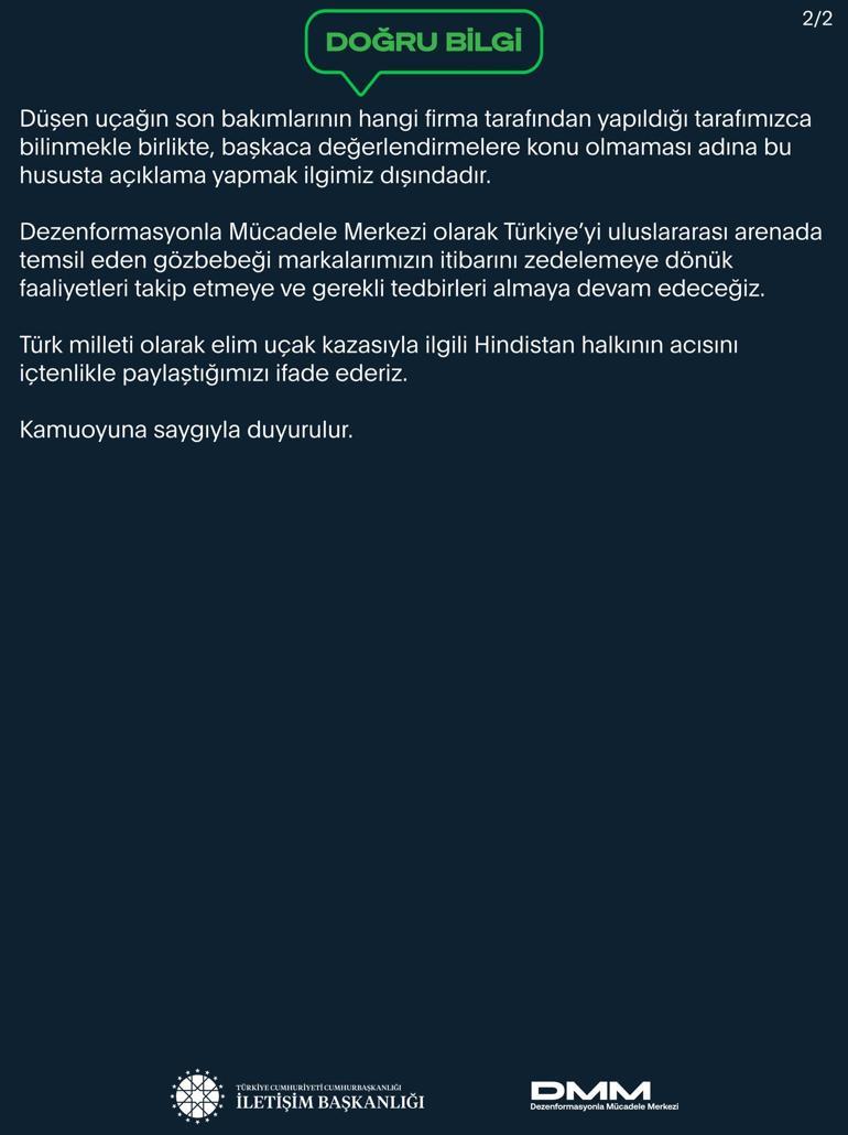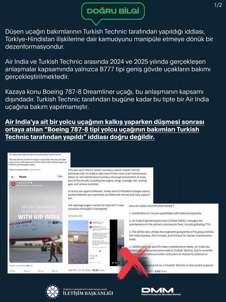 Dezenformasyonla Çaba Merkezi’nden yapılan açıklama şöyle; Air India’ya ilişkin bir yolcu uçağının kalkış yaparken düşmesi sonrası ortaya atılan “Boeing 787-8 tipi yolcu uçağının bakımları Turkish Technic tarafından yapıldı” savı yanlışsız değildir.