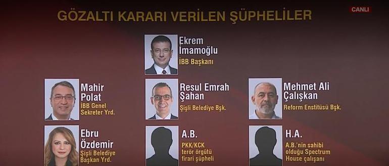 CNN TÜRK muhabiri Sinan Ağca, İstanbul Emniyet Müdürlüğü’nden son durumu aktardı. Sinan Ağca, “İki başka üniteye söz süreçlerini veriyor Ekrem İmamoğlu. Saat 10’u gösterdiğinde ise Ekrem İmamoğlu, terörle gayret gruplarına söz vermeye başladı. Uzman Polat, Resul Emrah Şahan, Mehmet Ali Çalışkan da gözaltındaydı. 7 şüphelinin ismi geçiyordu, 4’ü gözaltında 3’ü ise firari durumda. O isimler kimler? Şişli Belediye Lider yardımcısı Ebru Özdemir, PKK – KCK terör örgütü ideolojik alan yapılanma sorumlusu Azad Barış ve Hunav Altun bu isimler firari durumda. Azad Barış’ın Ekrem İmamoğlu ile çok fazla telefonda görüştüğü tezler arasında. Şişli Belediye Başkanı Resul Emrah Şahan ile İBB Genel Sekreter Yardımcısı Becerikli Polat telefonlarının şifresini polis takımlarına vermedi.” sözlerini kullandı.