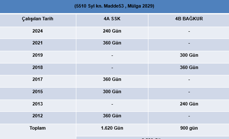 Örnek verecek olursak çalışma hayatına 2008 öncesinde başlayan bir kişinin ilgili devirlerde çalışmaları aşağıdaki tabloda verilmiştir.