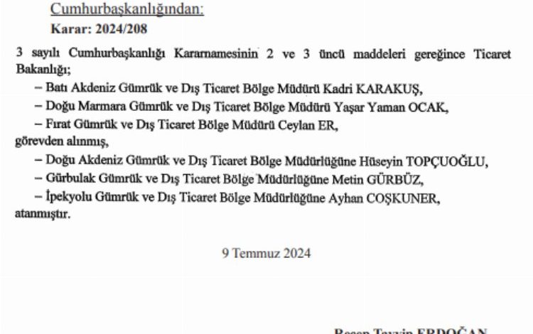 Cumhurbaşkanı Recep Tayyip Erdoğan’ın imzasıyla yayımlanan kararlara göre, Ticaret Bakanlığı Batı Akdeniz Gümrük ve Dış Ticaret Bölge Müdürü Kadri Karakuş, Doğu Marmara Gümrük ve Dış Ticaret Bölge Müdürü Yaşar Yaman Ocak ve Fırat Gümrük ve Dış Ticaret Bölge Müdürü Ceylan Er görevlerinden alındı. Doğu Akdeniz Gümrük ve Dış Ticaret Bölge Müdürlüğüne Hüseyin Topçuoğlu, Gürbulak Gümrük ve Dış Ticaret Bölge Müdürlüğüne Metin Gürbüz, İpekyolu Gümrük ve Dış Ticaret Bölge Müdürlüğüne Ayhan Coşkuner atandı.