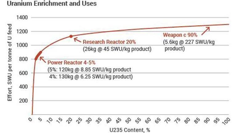 “Nükleer program, bir ülkenin barışçıl/sivil olarak yürüttüğü ve nükleer yakıt çevriminin ögelerini içeren faaliyetleridir. Nükleer yakıt çevriminde çift kullanımlı teknolojiler bulunur. Bunların birincisi doğal uranyumun yakıt olarak kullanılabilmesi için gereken orana çıkarmak olan ‘uranyum zenginleştirmedir.’ Hafif su reaktörlerinde gereken zenginleştirilmiş uranyum ölçüsü yüzde 3-5 oranında zenginleştirilmiş Uranyum-235’tir. Doğal haliyle U-235, cevherde yüzde 0.72 oranında yer alır. Reaktörde denetimli atomun parçalanması zincirleme tepkisi için gerekli ölçü yüzde 3 ila 5 ortasıdır. Atom bombası düzeyi için denetimsiz tepki ve yüksek ölçüde güç ortaya çıkması amaçlandığından tahrip gücü yüksek bir bomba için gereken ölçü yüzde 90 ve üzerinde (yüzde 95) zenginleştirilmiş U-235 gerekir. Kolay bir nükleer bomba için 25 kg kafidir. 0.72’den yüzde 3’e 5’e yani en fazla diyelim 5’e kadar yükseltmek çok kolay değildir. Yani harcadığınız emek fazladır. Yüzde 20 zenginleştirilmiş uranyum ise genelde araştırma reaktörlerinde kullanılır ve Milletlerarası Atom Gücü Ajansı’nın eşik dediği zenginleştirme oranı yüzde 20’dir. JCPO’ya nazaran zenginleştirme oranı en fazla yüzde 3.7’de tutulacaktı. İran da bunu onaylamıştı. Zira 5’ten 20’ye kadar giden yolda tekrar emek harcanır lakin 0.72’den 5’e kadarki zenginleştirme süreci kadar değildir. Lakin yüzde 20’den bomba düzeyi olan 90’a 95’e giden yol daha kısadır. Yani U-235, yüzde 20 zenginleştirildiğinde bomba düzeyine gelmesi için gereken emek çok daha azdır.”