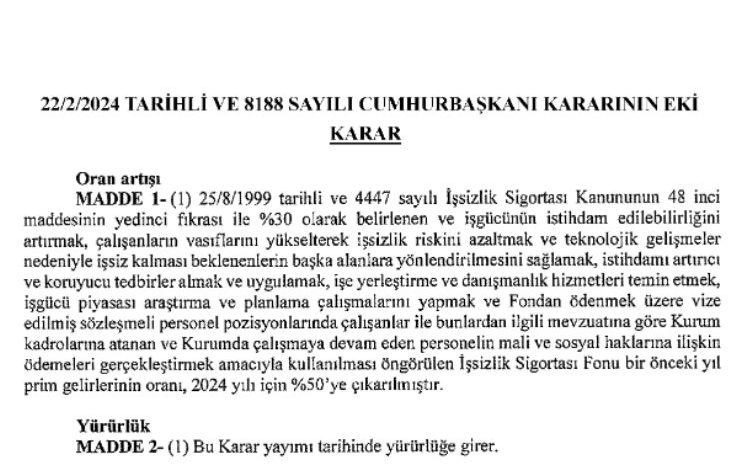 Resmi Gazete’de yayımlanan İşsizlik Fonu gelirlerine ilişkin Cumhurbaşkanı Kararı yayımlandı. Buna göre, söz konusu kanunda yüzde 30 olarak belirlenen İşsizlik Sigortası Fonu bir önceki yıl prim gelirlerinin oranının, 2024 yılı için yüzde 50’ye çıkarılması kararlaştırıldı.
