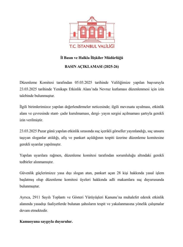 İstanbul Valiliği, Yenikapı’daki nevruz etkinliklerinde, yasa dışı slogan atan, pankart açan 28 kişi hakkında yasal süreç başlatıldığını ve düzenleme komitesi üyeleri hakkında hata duyurusunda bulunulduğunu bildirdi. Valilikten yapılan açıklamada, düzenleme komitesi tarafından 5 Mart’ta Valiliğe yapılan müracaatla, 23 Mart’ta Yenikapı Aktiflik Alanı’nda nevruz kutlaması için müsaade talebinde bulunulduğu kaydedildi.