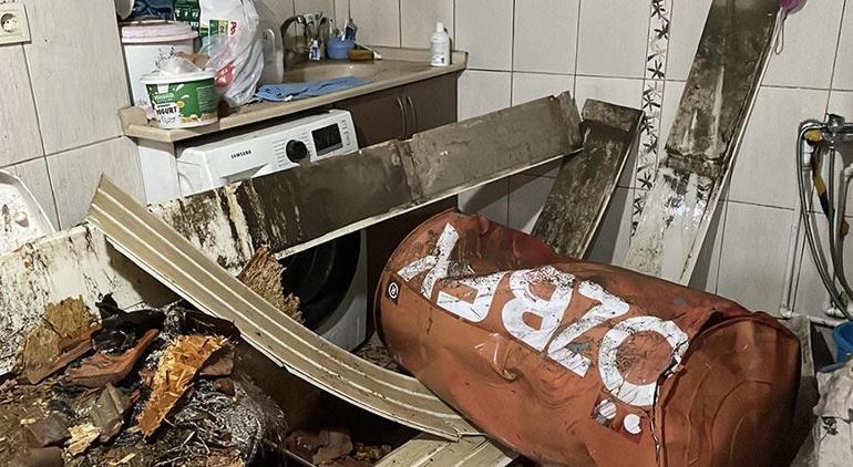 Çeştepe Mahallesi’nde bir binanın çatısındaki güneş gücünün su tankı yan taraftaki binanın çatısına düştü. Çatıyı delen tank, konutun banyosuna girdi.