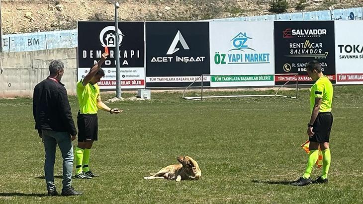 Sahada yatan köpeği görünce oyunu durduran hakem Murat Balıkçı, akabinde koşarak yanına gittiği köpeğe evvel kırmızı kart gösterdi.