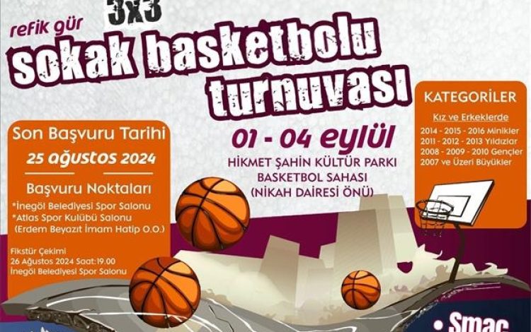 Zaferden Kurtuluşa Refik Gür Sokak Basketbolu Turnuvası için başvurular 25 Ağustos tarihine kadar devam edecek. Sokak Basketbolu turnuvası kayıtları Hikmet Şahin Kültür Parkı içerisinde bulunan Belediye Spor Salonunda alınacak. 26 Ağustos saat 19.00’da Belediye Spor Salonunda fikstür çekimi yapılacak. Turnuva kız ve erkekler grubu olmak üzere 2 ayrı grupta; 2014-15-16 doğumlu sporcular (minikler), 2011-12-13 doğumlu sporcular (yıldızlar), 2008-09-10 doğumlu sporcular (gençler) ve 2007 ve üzeri sporcular (büyükler) olacak şekilde 4 ayrı kagtegoride gerçekleştirilecek.