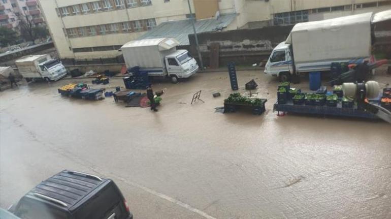 Elazığ’da ansızın bastıran kuvvetli sağanak, semt pazarını adeta göle çevirdi. Meteorolojinin ikazlarının akabinde tesirli olan yağış cadde ve sokakları suyla doldururken, pazarcı esnafı da büyük ziyan gördü. Pazar yerinde kurulan tezgahlar sular altında kalırken, zerzevat ve meyve kasaları sel sularına kapılıp sürüklendi. Şemsiyelerin devrildiği pazarda, tezgahlar da ziyan gördü. O anlar cep telefonu kamerasına yansıdı.