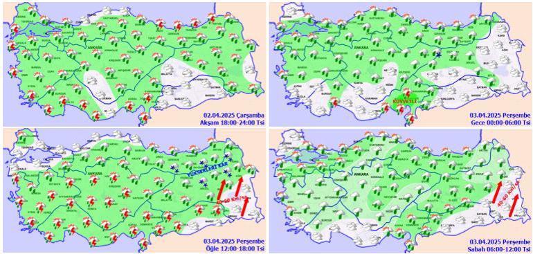 RÜZGAR: Çoklukla güneyli taraflardan hafif, orta sıra orta kuvvette, yarın (Perşembe) sabah saatlerinden sonra Doğu Anadolu’nun güneydoğusunda kuvvetli (40-60 km/saat) eseceği varsayım ediliyor.