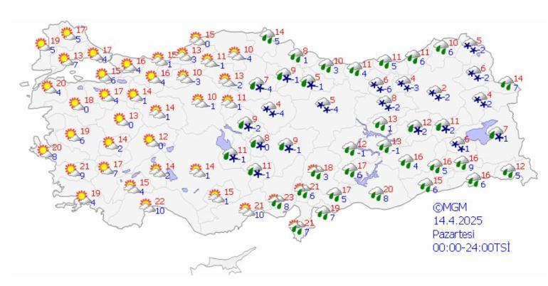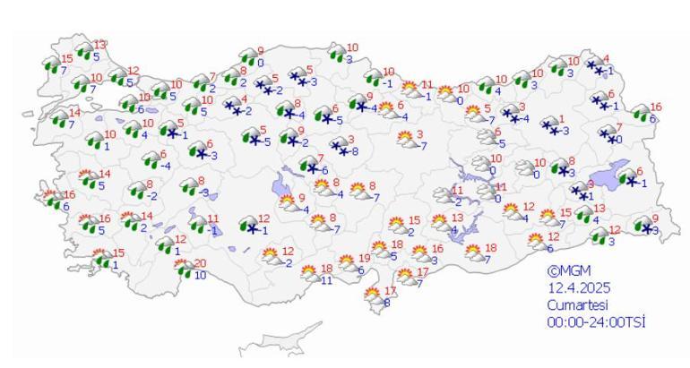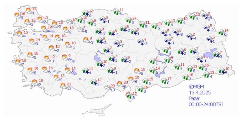 Çok bulutlu, gece saatlerinden itibaren aralıklı yağmur ve karla karışık yağmurlu geçeceği kestirim ediliyor. Yağışların, bu gece saatlerinde yer yer kuvvetli olması bekleniyor.