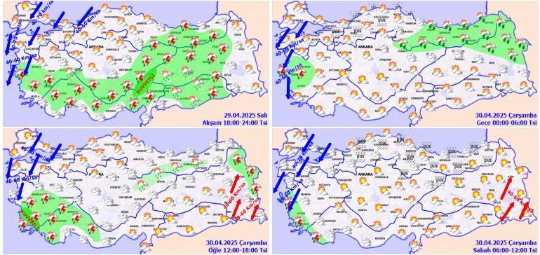 RÜZGAR: Ekseriyetle kuzey ve kuzeydoğu, güneydoğu kesitlerde güneybatılı taraflardan hafif, orta sıra orta kuvvette, Marmara ile Kuzey Ege kıyılarında kuzeydoğu taraflardan kuvvetli ve fırtına (40-70 km/saat) formunda, Doğu Anadolu’nun güneydoğusunda güneybatılı taraflardan kuvvetli (40-60 km/sa) esmesi bekleniyor.