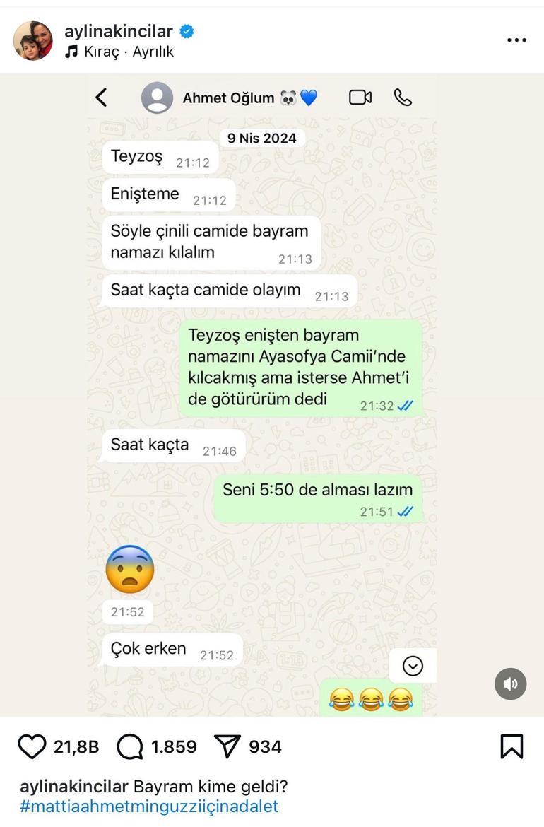 Kadıköy’de uğradığı bıçaklı atak sonucu hayatını kaybeden Matteo Ahmet Minguzzi’nin teyzesi Aylin Akıncılar, toplumsal medyada yeğeni ile geçen yıl bayram namazı ile ilgili yaptığı konuşmanın ekran fotoğrafını “Bayram kime geldi” notuyla paylaştı.