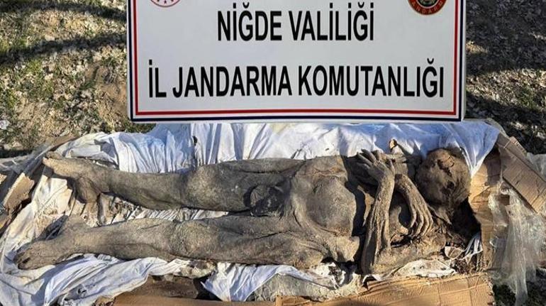 Niğde’de Orta Çağ’a ilişkin olduğu bedellendirilen insan mumyasını satmaya çalışan 6 kişi, jandarma tarafından yakalandı. Beden bütünlüğünün bozulmadığı görülen mumya ise yetkililere teslim edildi.