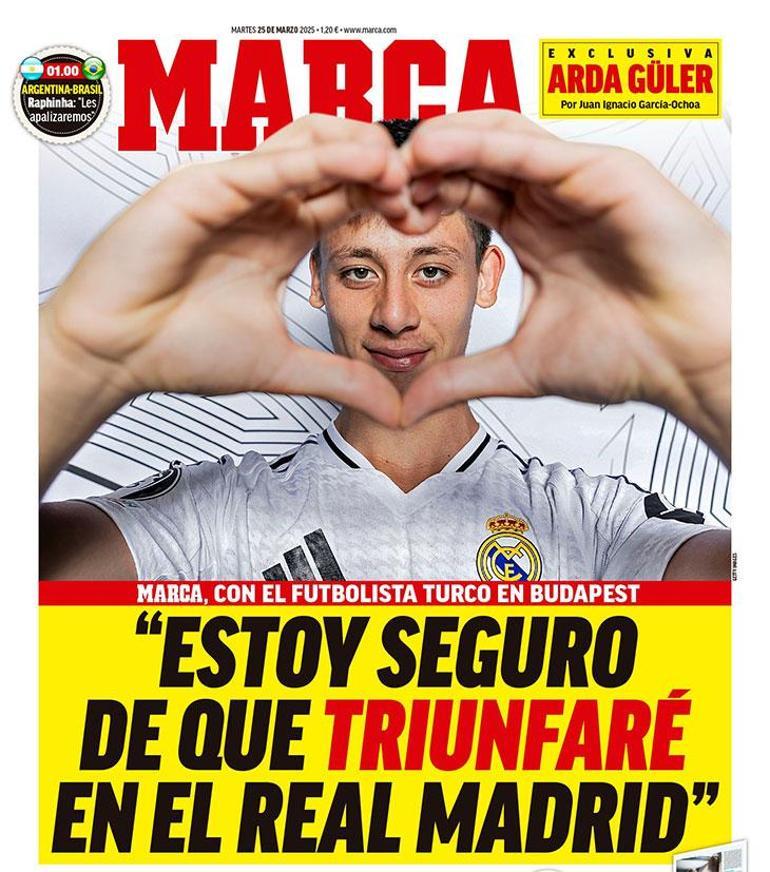 Son devirde Real Madrid’de mühlet bulmakta zorlanan genç yetenek Marca’ya verdiği röportajda amaçları hakkında konuştu ve ayrılık sorusuna cevap verdi. Marca ise Arda Güler’in açıklamalarını tam sayfa manşet olarak okurlarına taşıdı.