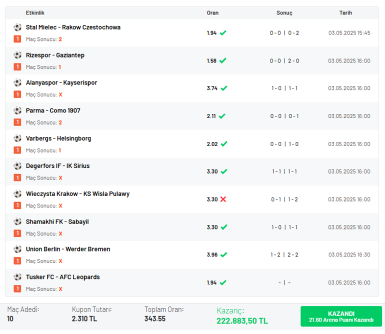 Kuponuna eklediği 10 müsabakadan yalnızca Maç Sonucu X oynadığı Wieczysta Krakow – KS Wisla Pulawy müsabakasını bilemeyen Misli üyesi, bu maçı da bilse milyonlar kazanma talihine sahipti. Yeniden de 10 maçın 9’unu bilerek 222.883,50 TL kazandı. Misli üyesi birebir vakitte bu kuponuyla Misli Arena’da günün “En Yeterli 20 Kuponu” ortasında yer aldı.