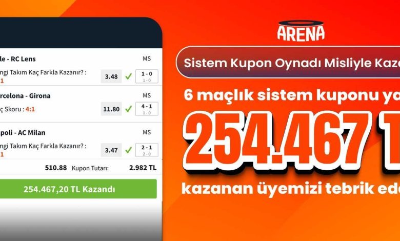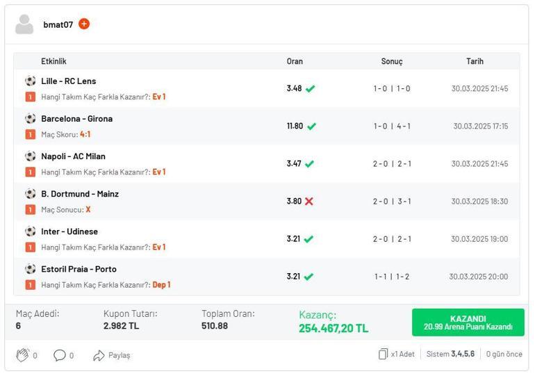 Üyenin kuponunda bildiği öbür maçlar ise Lille-RC Lens, Napoli-AC Milan, Inter-Udinese ve Estoril Praia-Porto maçlarıydı. Estoril Praia-Porto maçına ‘’Deplasman Grubu 1 Farkla Kazanır’’, öteki 3 maça ise ‘’Ev Sahibi Kadro 1 Farkla Kazanır’’ oynayan Misli üyesi bu maçları da gerçek kestirim etti. Üyenin kuponunda bilemediği tek maç ise berabere biter dediği lakin 3-1 sonuçlanan B. Dortmund-Mainz maçıydı. Sistem 3,4,5,6 oynayan üye, kuponuna yazdığı 6 maçtan 1’ini bilememesine karşın sistem oynadığı için 254.467 TL kazandı. Üye, bu kuponuyla Misli Arena’da günün en yeterli kuponları ortasında birinci sırada yer aldı.