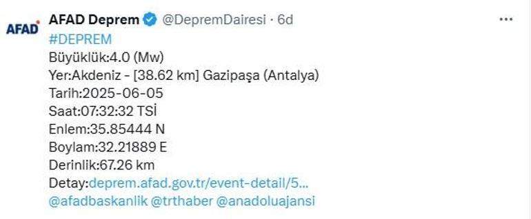 AFAD, saat 04.32’de merkez üssü Antalya’nın Gazipaşa ilçesi açıkları olan 4 büyüklüğünde bir sarsıntı meydana geldiğini duyurdu.