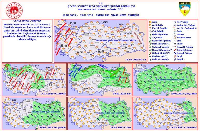 Öte yandan, sıcaklıkların Balkanlar üzerinden gelecek soğuk ve yağışlı havanın tesiriyle 18 Mart Salı gününden itibaren ülke genelinde 10 ila 15 derece azalarak mevsim normallerinin altına düşmesi bekleniyor.