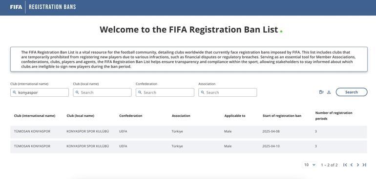Süper Lig’de istikrarsız bir dönem yaşayan ve küme düşme çizgisinden kurtulmak için gayret veren Konyaspor’a bir berbat haber de FIFA’dan geldi. FIFA’nın internet sitesinde yer alan bilgiye nazaran; Konyaspor, 10 Nisan 2025 başlangıç tarihinden itibaren 3 periyot transfer yasağı cezası aldı.