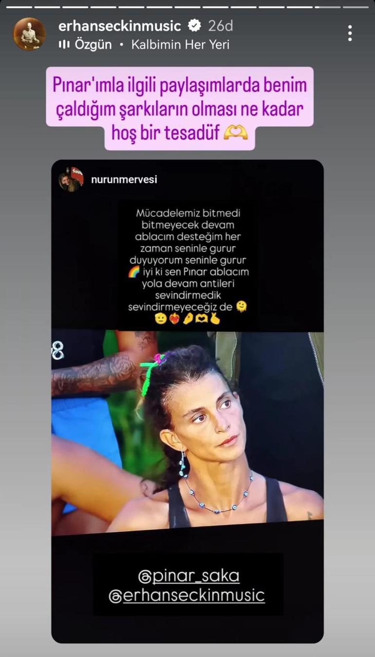Pınar Saka’nın müzisyen eşi Erhan Seçkin, eşinin Asena’yı eleyip yarışta kalmasının akabinde Instagram hesabından peş peşe paylaşım yaptı.