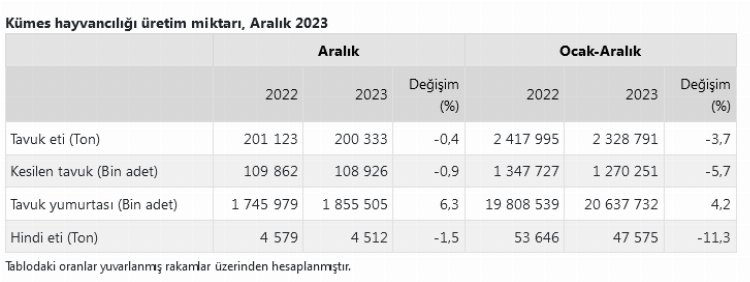 Ocak-Aralık döneminde bir önceki yılın aynı dönemine göre, tavuk yumurtası üretimi yüzde 4,2 arttı, kesilen tavuk sayısı yüzde 5,7 azaldı, tavuk eti üretimi yüzde 3,7 azaldı, hindi eti üretimi yüzde 11,3 azaldı.